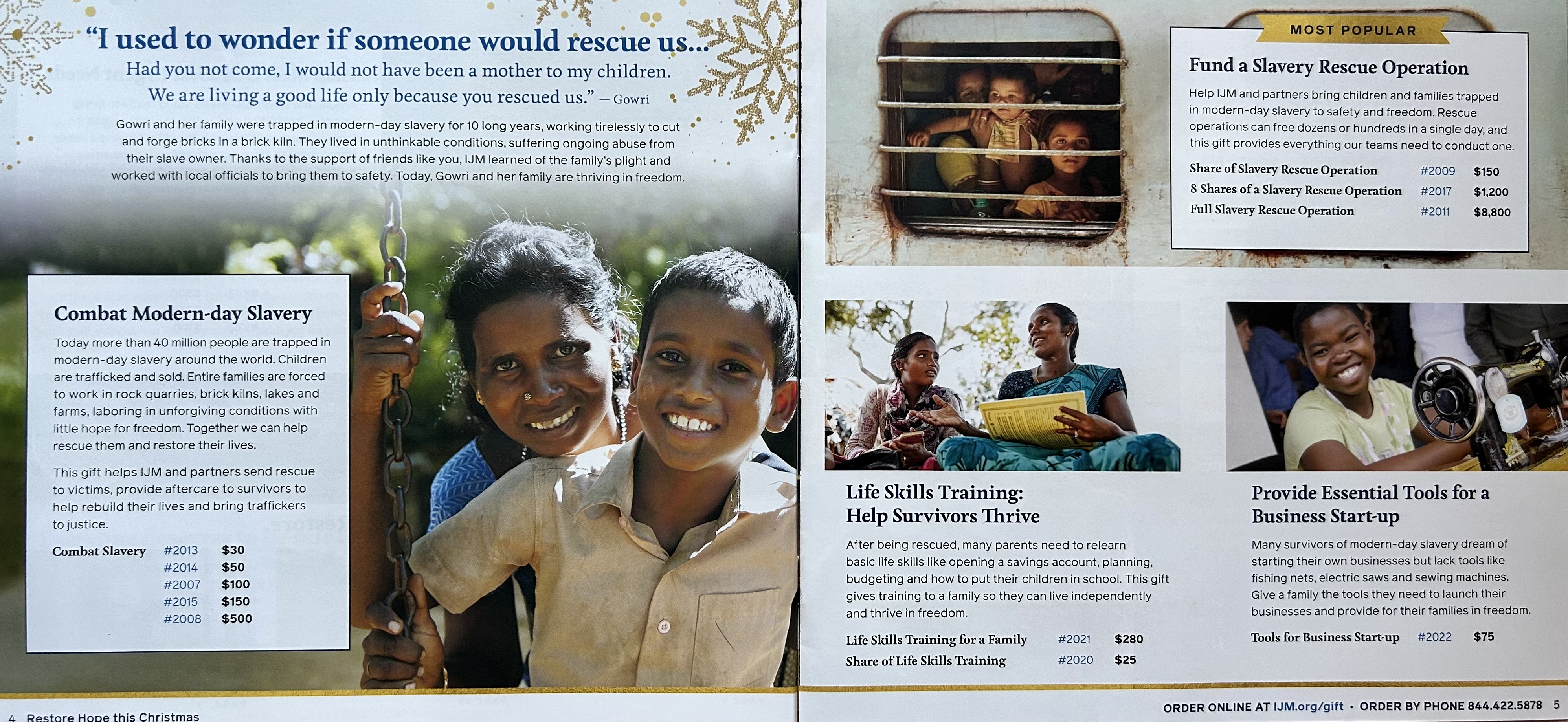 International Justice Mission’s holiday gift catalog was a popular item with donors. However, the catalog did not align with industry best practices: cluttered with long-form survivor stories and an abundance of products, many of which were poorly performing. Given the uniqueness of this fundraising offering and the need to drive giving in the fourth quarter, we believe that redesigning the catalog would increase revenue.